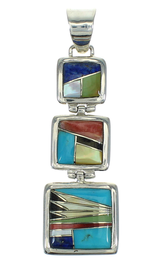 MATERIALS: Sterling Silver, real Turquoise, Lapis, Jet, Red Oyster Shell, Yellow and White Mother of PearlMEASUREMENTS: Pendant measures approximately 2" long (including bail) and 5/8" at widest point. DESCRIPTION: The American Southwest is known for its amazing landscapes, historical culture, and unique...