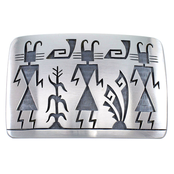 MATERIALS: Sterling silver. MEASUREMENTS: Belt buckle measures approximately 2" long, 3" wide, will fit a belt that is up to 1-1/2" wide, and weighs 54 grams. DESCRIPTION: This magnificent and traditional belt buckle represents the finest of Hopi craftsmanship! This...