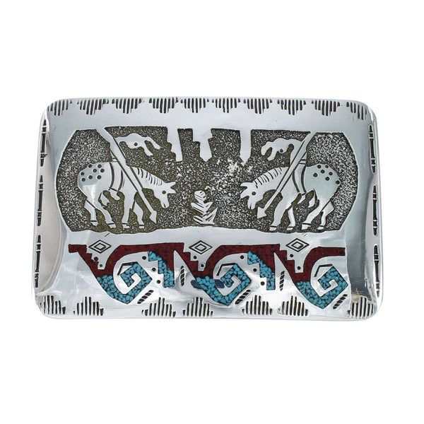 MATERIALS: Sterling silver. MEASUREMENTS: Belt buckle measures approximately 1-7/8" long, 2-7/8" wide, will fit a belt that is up to 1-1/2" wide and weighs 58 grams. DESCRIPTION: Enjoy the amazing craftsmanship exhibited in this belt buckle! This piece of Native...