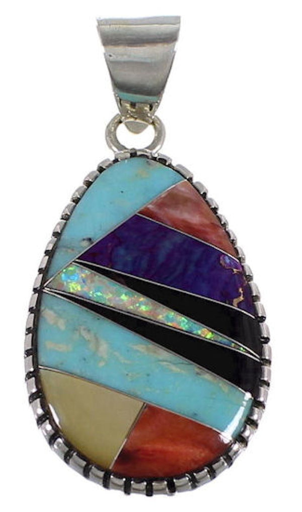 MATERIALS: Sterling silver, Turquoise, Oyster Shell, Yellow Mother of Pearl, Magenta Turquoise, Black Jade and Opal (Matrix in the inlay may vary slightly). MEASUREMENTS: Pendant measures approximately 1-5/8" long (including bail) and 3/4" at widest point. DESCRIPTION: If you are...