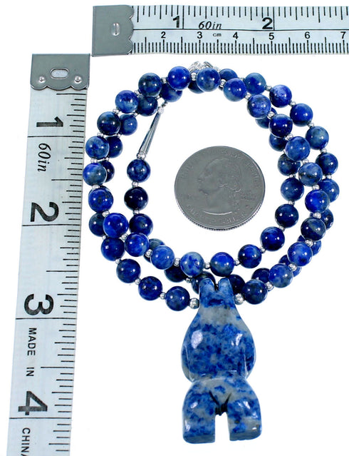 You will absolutely fall in love with this stunning necklace! This piece of Southwest style jewelry is hand strung out of genuine sterling silver and real Denim Lapis beads. The necklace consist of: 2-mm and 3-mm silver round beads, 5-mm Lapis round beads, along with a magnificent 40-mm Denim Lapis bear bead in the center for a really unique look!