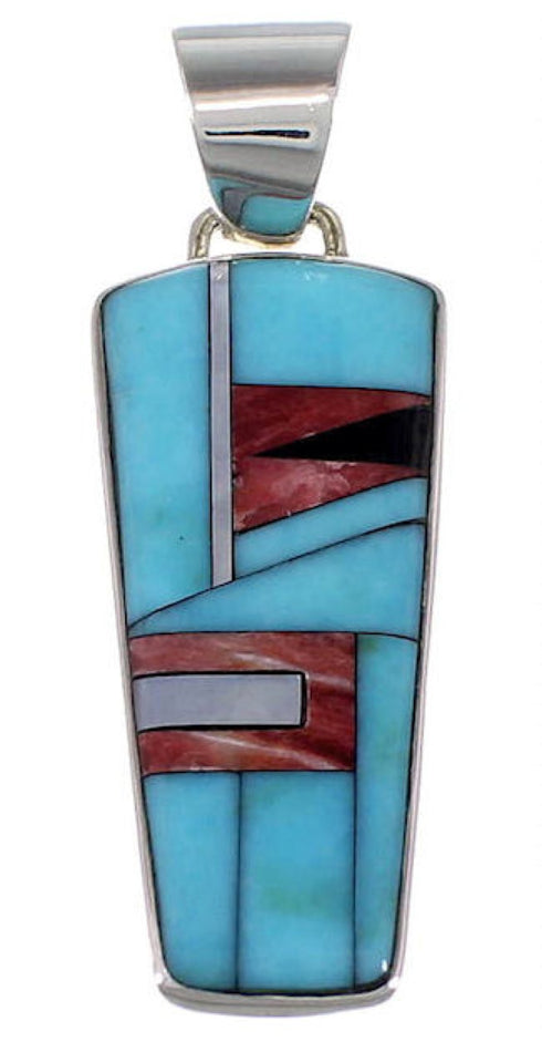 This is truly an outstanding pendant that will make a great impression! The pendant is handmade out of genuine sterling silver and Multicolor inlay. The inlay consists of: real Turquoise, Red Oyster Shell, Black Jade, and Mother of Pearl. The inlay is gently set, while creating a lovely design for a perfect finish. The pendant is stamped sterling.