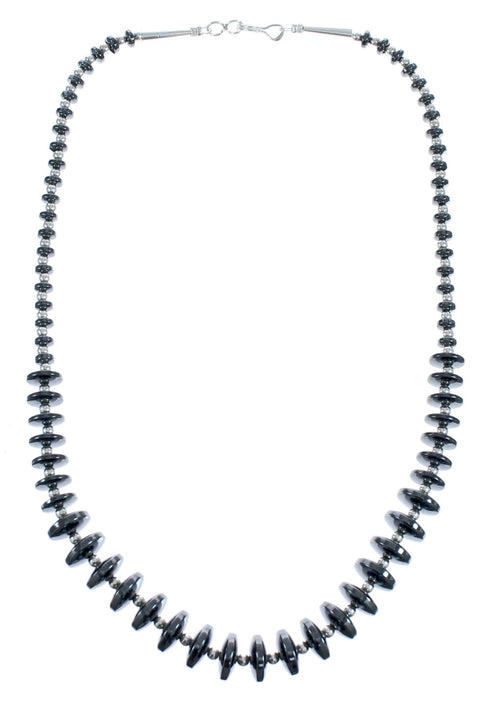 This is a very exquisite necklace that must not be overlooked! This piece of Southwest jewelry is hand strung out of genuine sterling silver and real Hematite beads. The necklace consists of 3-mm silver round beads, along with Hematite wheel beads that beautifully graduate allowing the largest center beads to measure 11-mm and the smallest beads at the end to measure 4-mm. Each end of the necklace is completed with a silver cone and bead for a fascinating finish. The cones are stamped sterling.