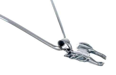 The pendant is in the shape of a horse which is made out of sterling silver.