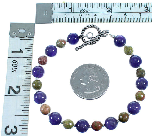 Take advantage of the great price on this amazing bracelet! This piece of Southwest style jewelry is hand strung out of genuine sterling silver, along with Amethyst, and Unakite beads. The bracelet consists of: 2-mm silver round beads, 8-mm Amethyst round beads, and 6-mm Unakite round beads. The bracelet is completed with a twisted silver toggle clasp for an extraordinary finish.